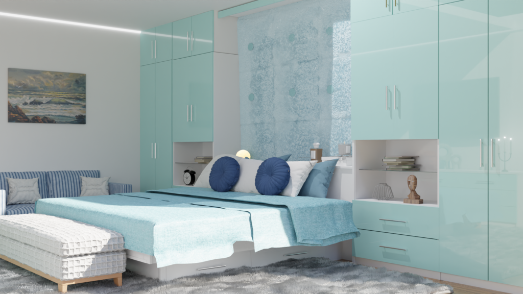Surrounding the bed, the cabinetry in matching aqua creates an atmosphere of cohesive calm, their sleek design providing ample storage that's as discreet as it is spacious.