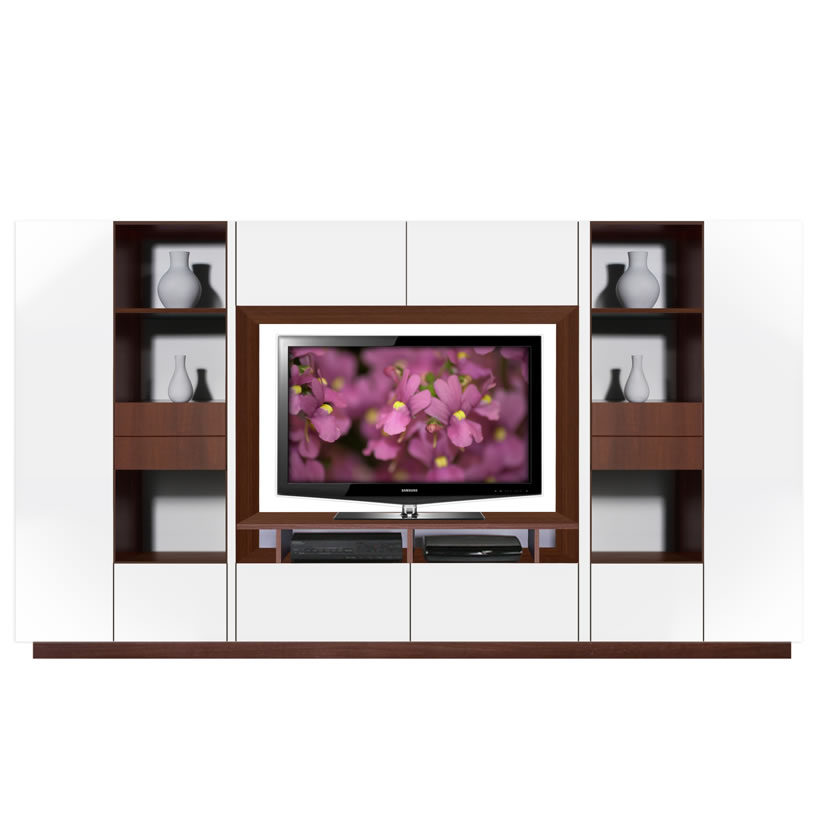 The Lucus entertainment wall unit is a large, contemporary wall unit that does so much more than house the television. The large, symmetrical design offers a relatively minimalistic appearance while it discreetly holds a large amount of storage space.