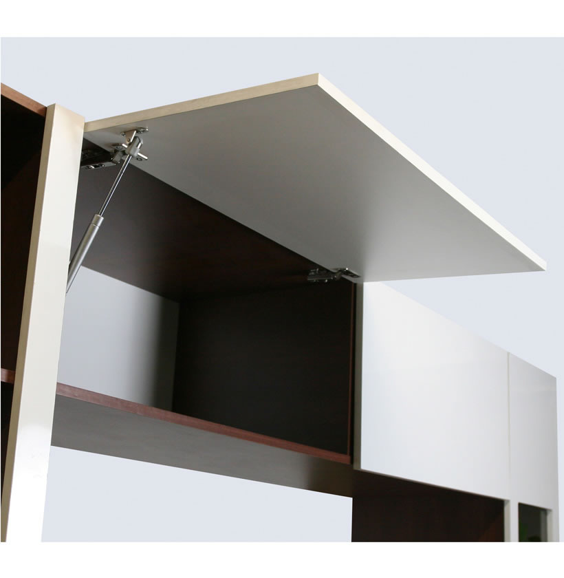 Upper areas offer additional concealed storage on upward opening pneumatic hinges