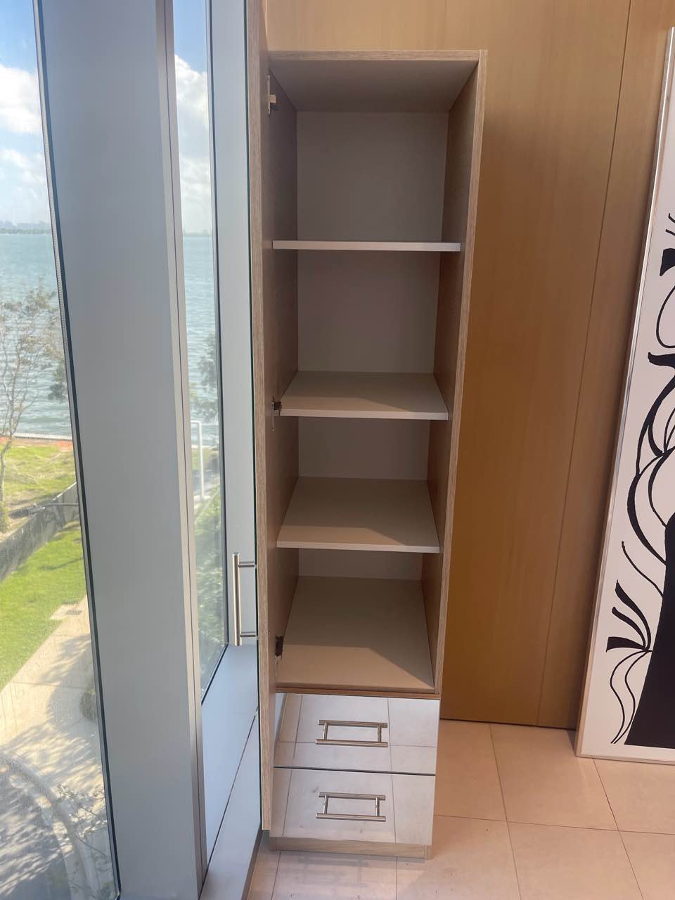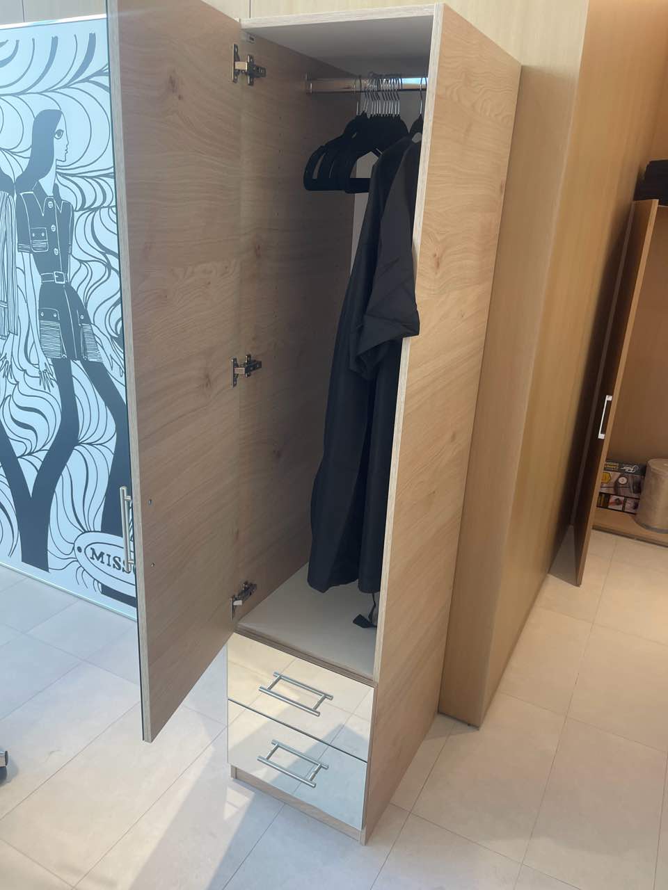 This elegant storage solution for a Miami hair salon combines two complementary Alta Narrow units designed to maximize organization in a stylish, space-conscious footprint. The pair includes an Alta Narrow Wardrobe Closet with left-hinged door and two exterior drawers, alongside an Alta Narrow Storage Closet featuring the same door configuration plus three adjustable interior shelves. Both pieces were carefully selected to provide ample storage for salon essentials including smocks, supplies, and styling tools.