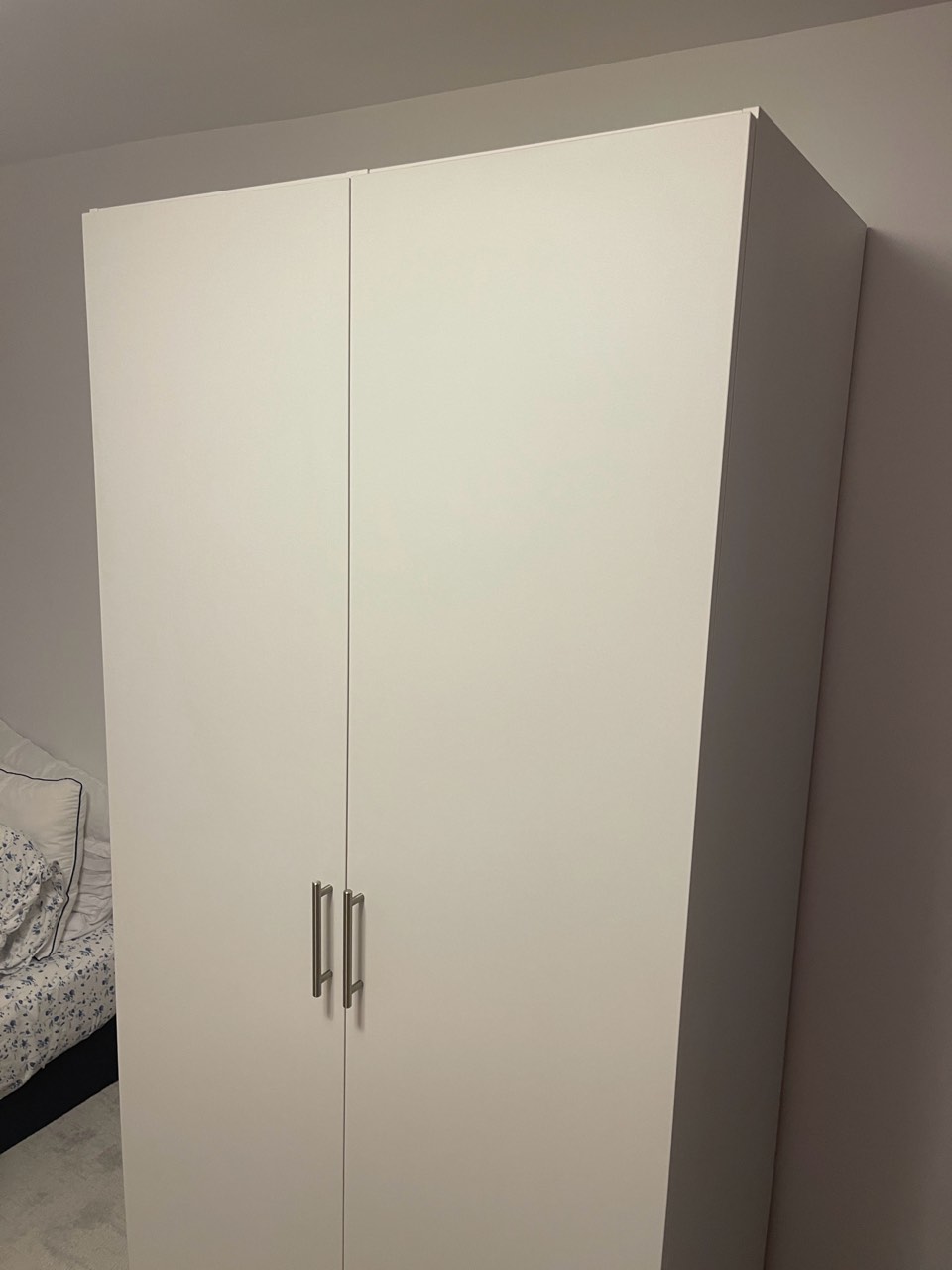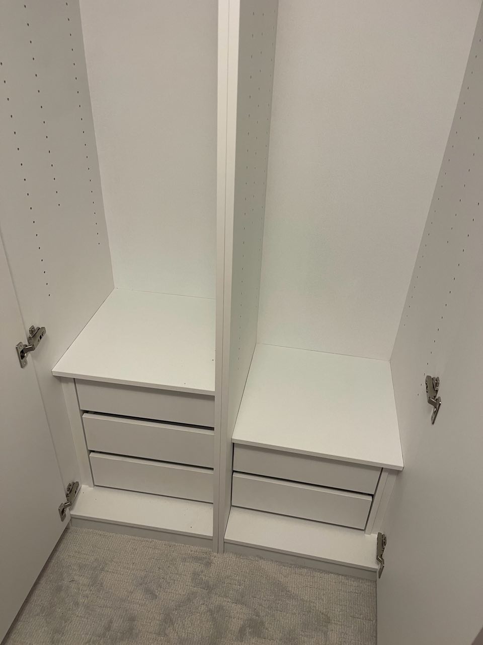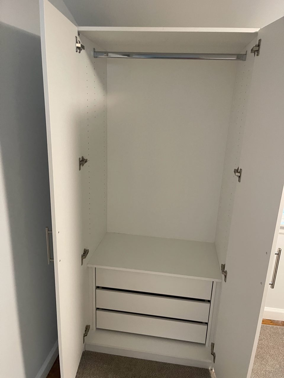 The second wardrobe was custom designed to complement the first while addressing specific storage needs. While maintaining the same exterior appearance—identical height, white matte finish, and outward-swinging double doors—this unit features a divided interior with specialized drawer configurations. The left compartment includes three interior drawers at the bottom, while the right side provides two drawers, offering tailored storage solutions while preserving the cohesive design language throughout the home.