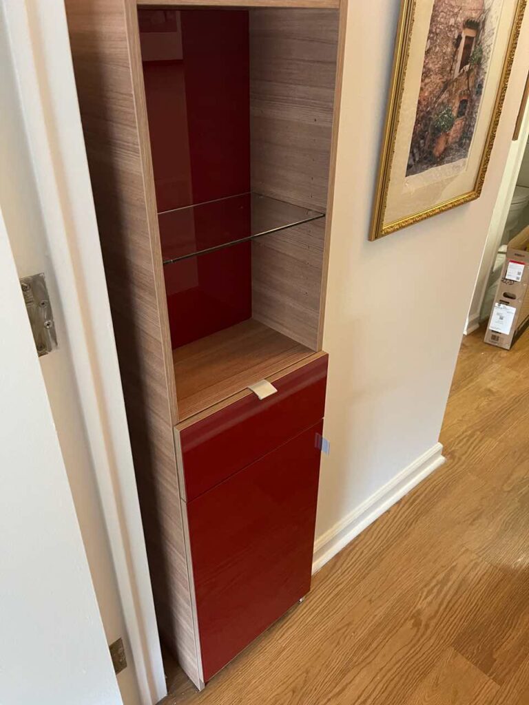 - Front Finish: Light Walnut Matte, Mirrored & Colonial Red Colored Glass