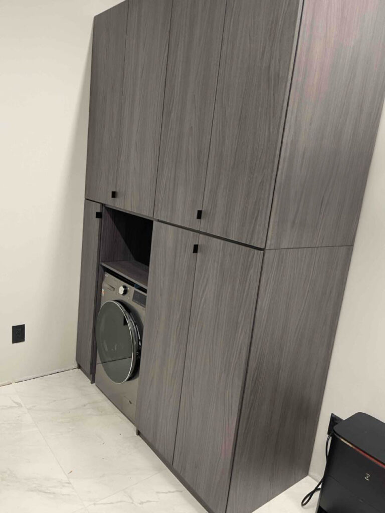 The first unit creates a dedicated organization zone with integrated hanging hooks for coats, bags, and accessories, complemented by bench seating and drawer storage for shoes and smaller daily essentials. The second unit serves as a custom washer cabinet, providing a built-in housing solution that integrates the washing machine seamlessly into the room's design while offering additional storage above and around the appliance.