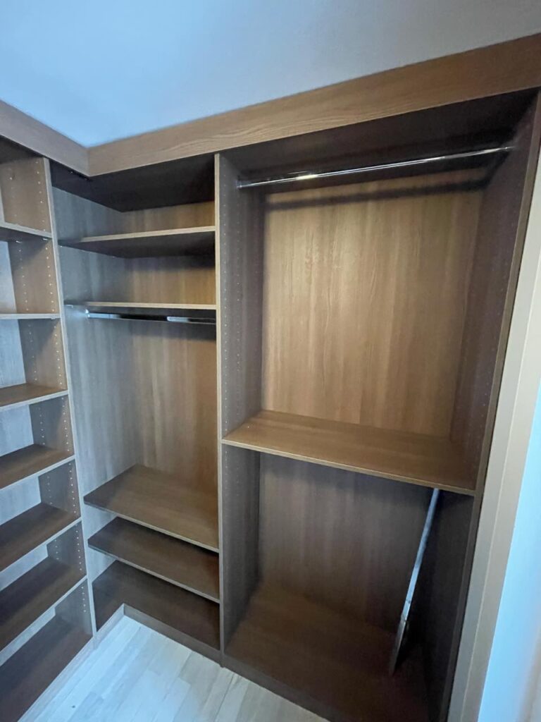 This custom closet represents the pinnacle of wardrobe organization, where every item has a designated place and everything remains visible and accessible. The handleless design maintains clean lines while the open storage concept eliminates barriers between you and your clothing, creating a shopping-in-your-closet experience that makes getting dressed a pleasure rather than a chore.