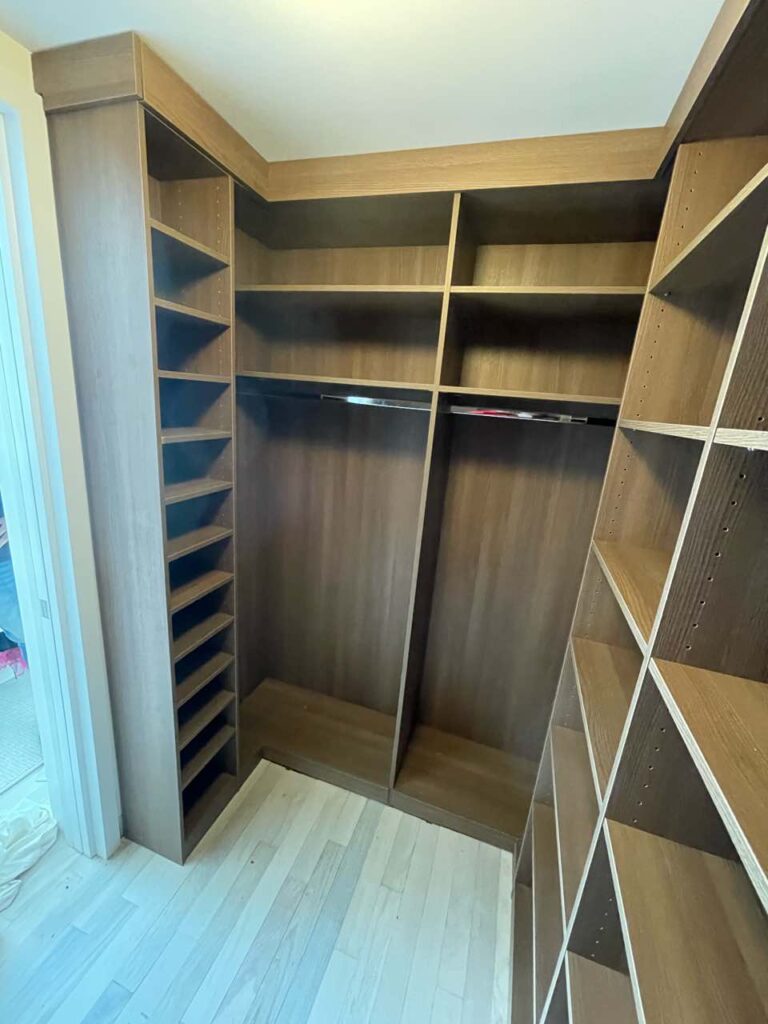 The warm Light Walnut Matte finish throughout creates a cohesive, spa-like environment that brings natural beauty and calming sophistication to your daily routine. This rich wood tone adds organic warmth while the matte surface ensures a soft, non-reflective appearance that maintains the serene atmosphere essential to a well-designed closet space. The consistent finish across all components creates visual unity that makes the extensive storage system feel intentional and luxurious.