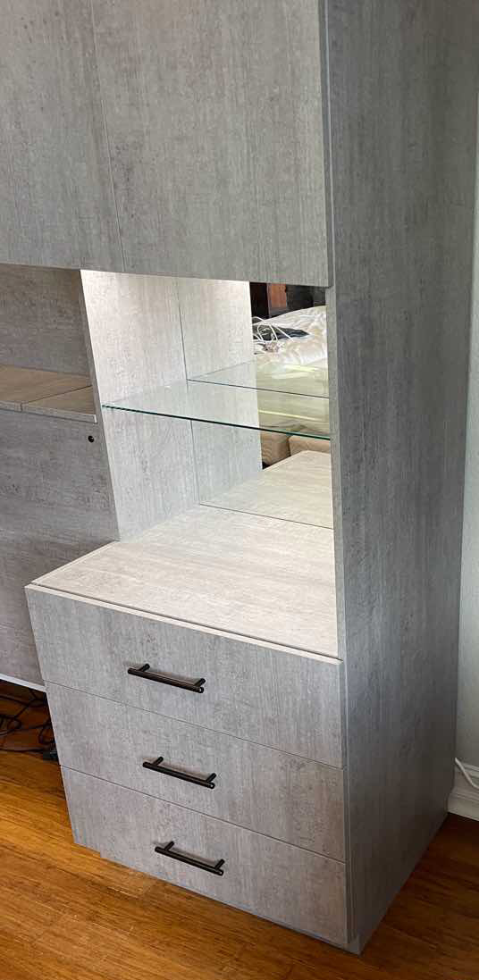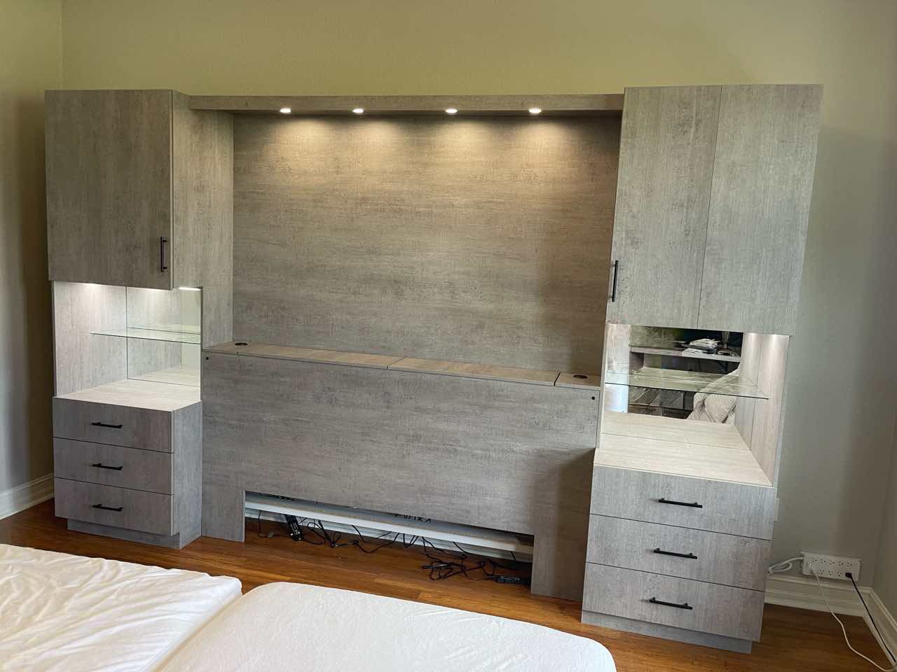 This bedroom installation upgrades the storage capacity for this Miramar Lakes, Florida home with a custom pier wall headboard system designed for a king-size bed.