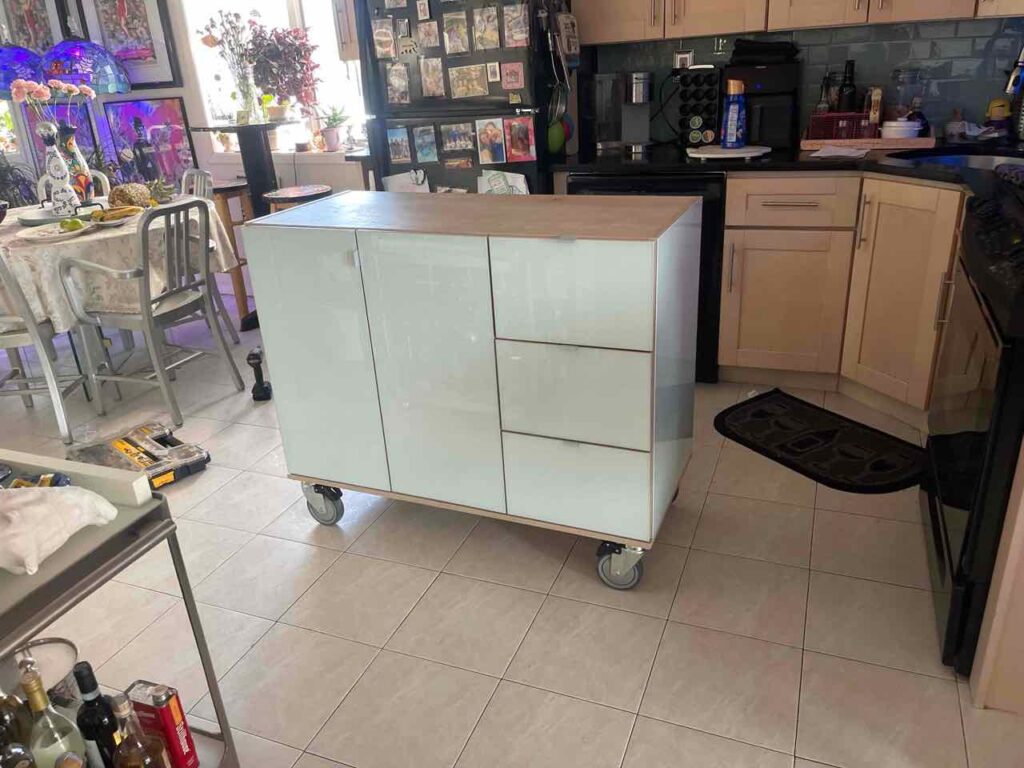This mobile kitchen island is yet another custom order designed by our team. Finished in our elegant Icicle colored glass fronts and White Wash case this unit provides both added functionality and style to this kitchen.