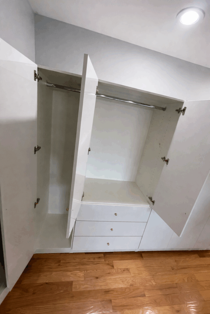 Inside, the Alta wardrobes reveal a thoughtfully organized interior with chrome hanging rods for full-length garments and multiple built-in drawers for folded clothing, accessories, and linens. This level of interior customization is what sets Contempo Space’s wardrobe collections apart — every shelf height, drawer depth, and hanging section is tailored to the client’s specific storage needs.