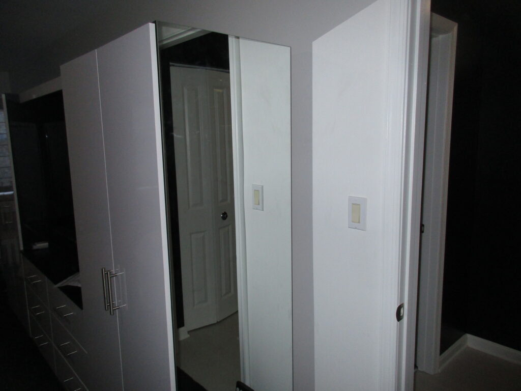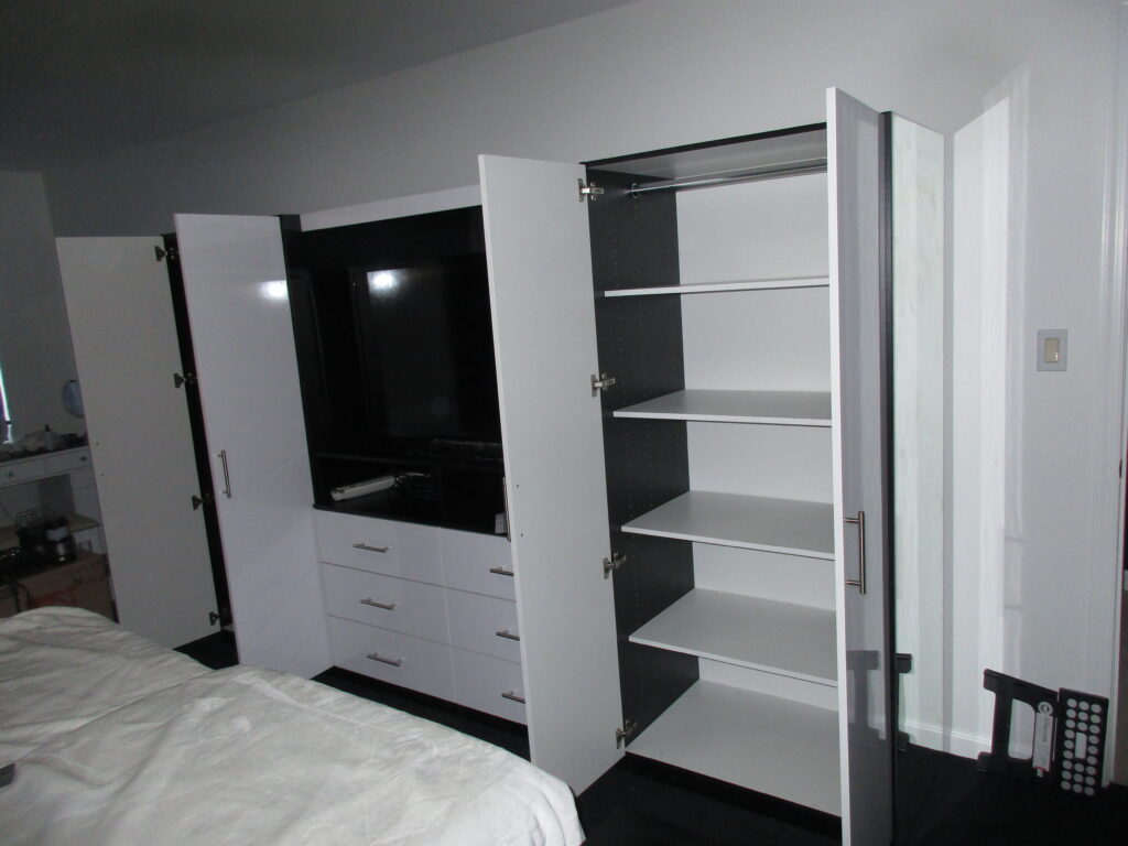 This custom TV Armoire delivered to Owings Mills, Maryland is a bedroom storage wall that covers every base — media, clothing, and everyday organization — all within one cohesive, high-contrast design. White Glossy front panels span the full width of the unit, their reflective sheen catching the light and keeping the overall look crisp and contemporary against the room's dark backdrop.